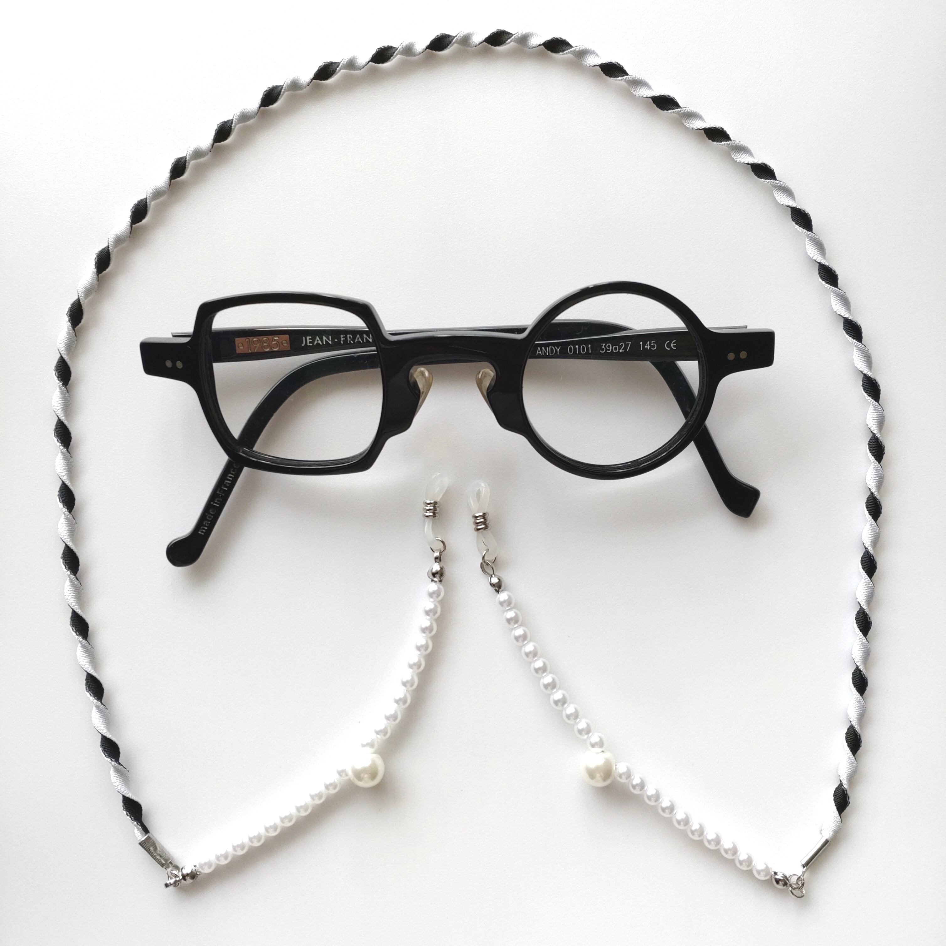 シロとクロのクルクル巻きデザインゴムの両サイドに、パールをポイント使いしたメガネチェーンです。