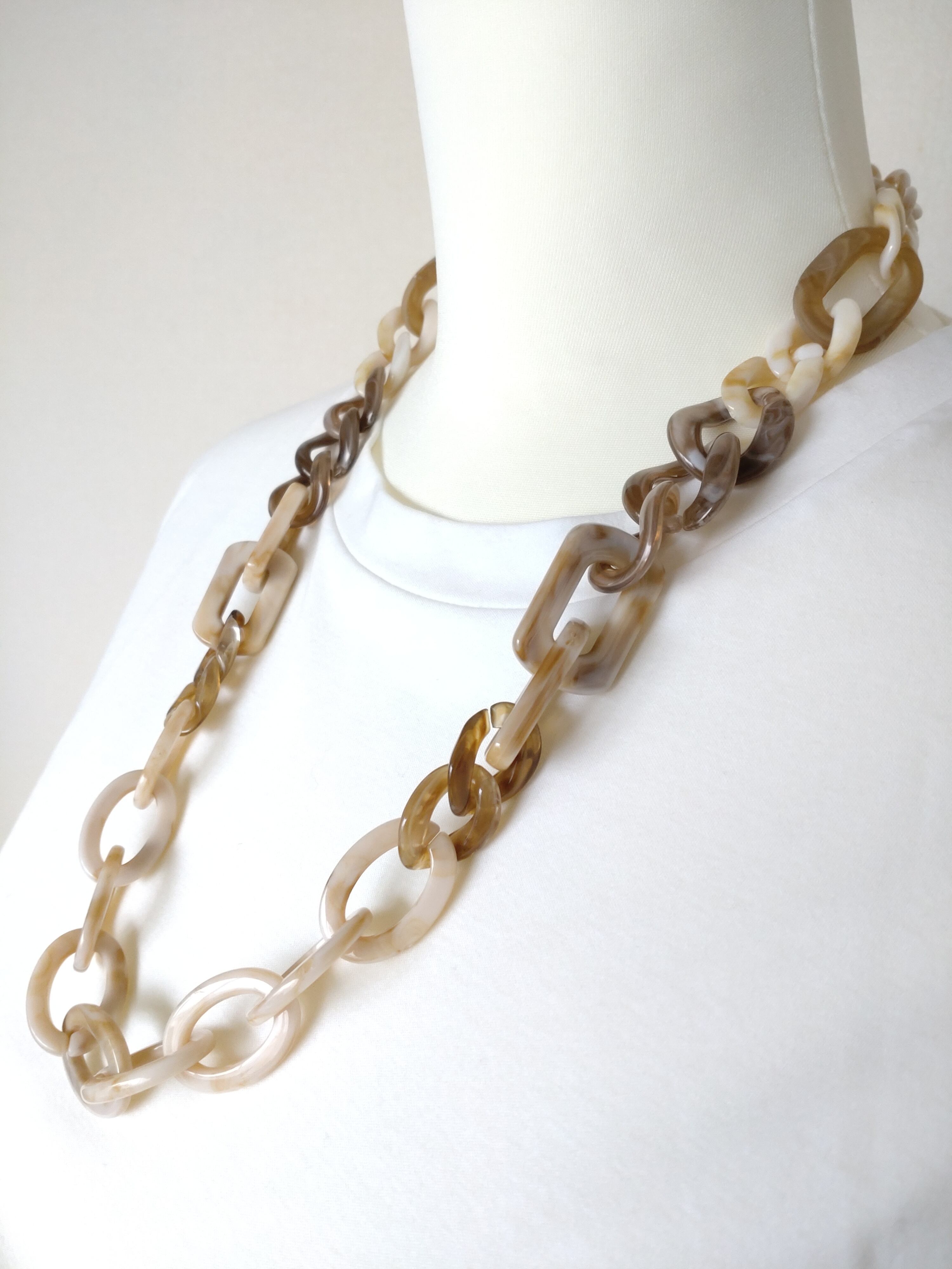 大小のマーブル調アイボリーカラーをメインに、ブラウンカラーをポイント使いした2WAYチェーンで、ボリュームのあるアクセサリーや個性的なアクセサリーがお好きな方にはお勧めです。