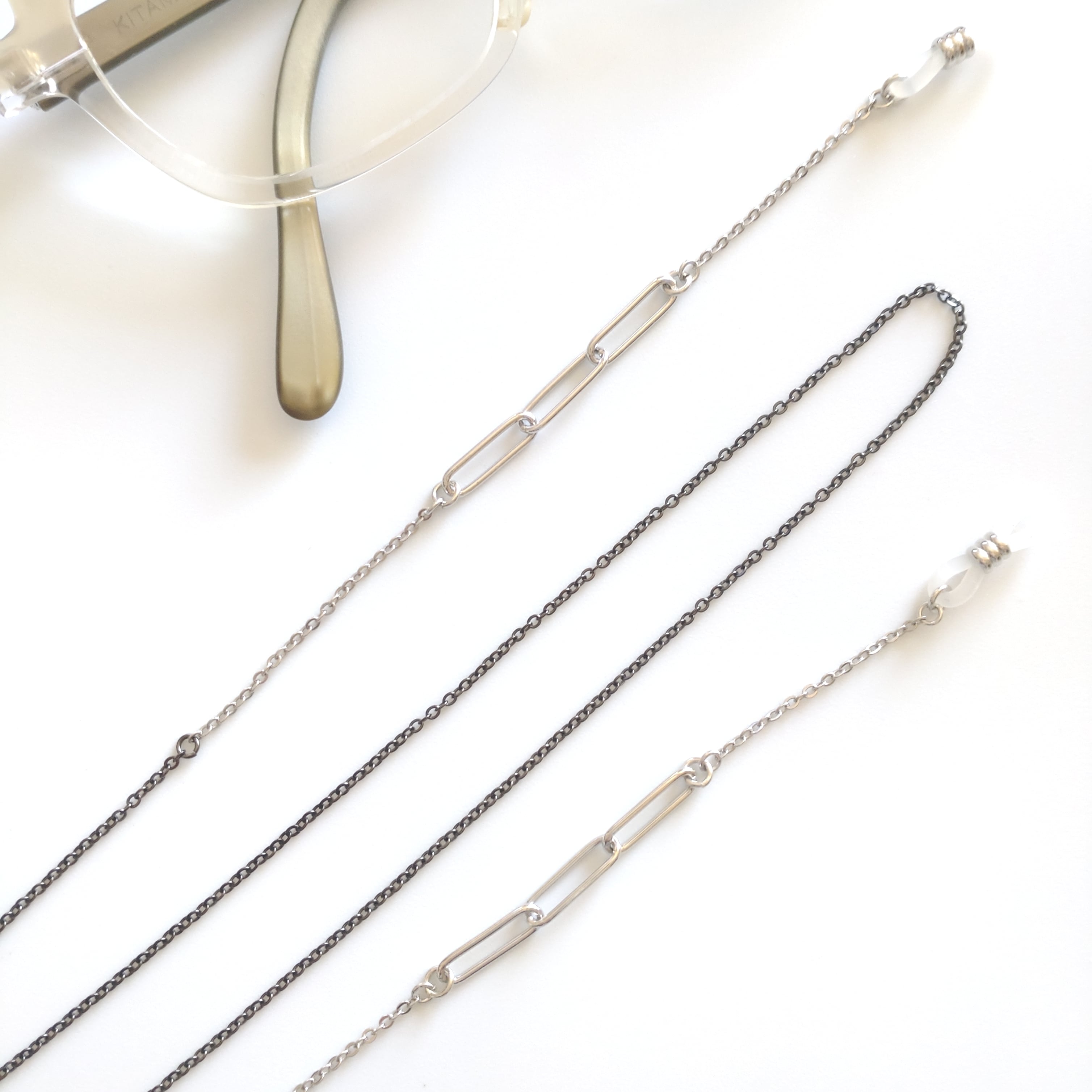 国産のガンメタカラーとシルバーカラーチェーンに、スクエアチェーンをポイント使いしたシンプルな中にもお洒落心のあるグラスコードです。
