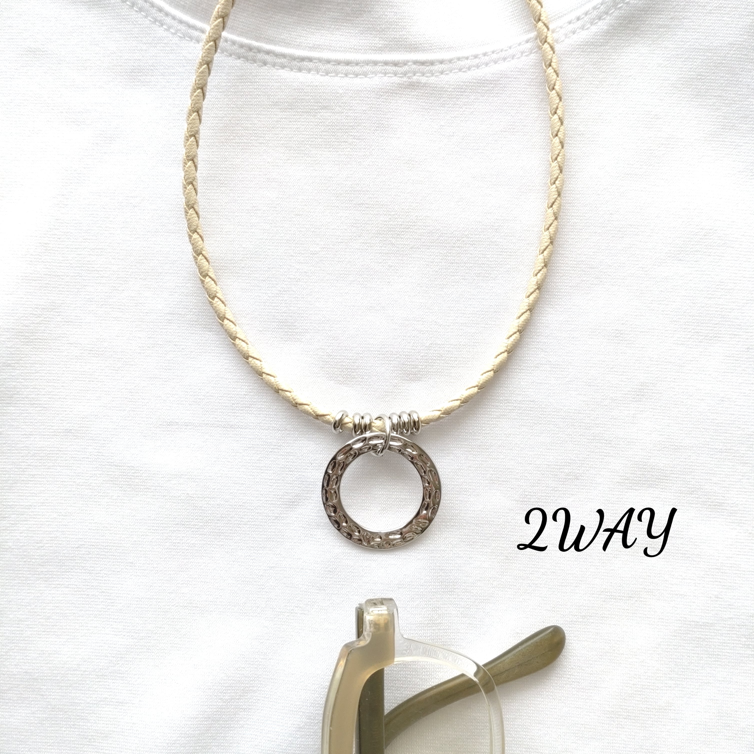 アイボリーカラーの合皮四つ編みコードに、シルバーカラーのポイントを下げたメガネホルダー