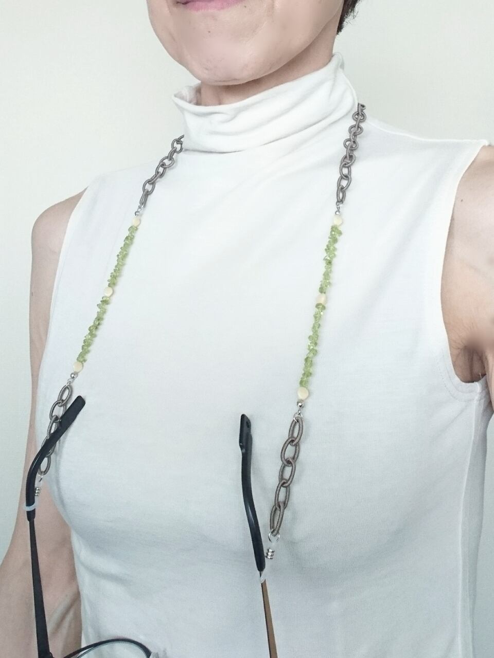 ペリドットとチェコガラスを、グレー系のナイロン巻きチェーンと組ませてみました。